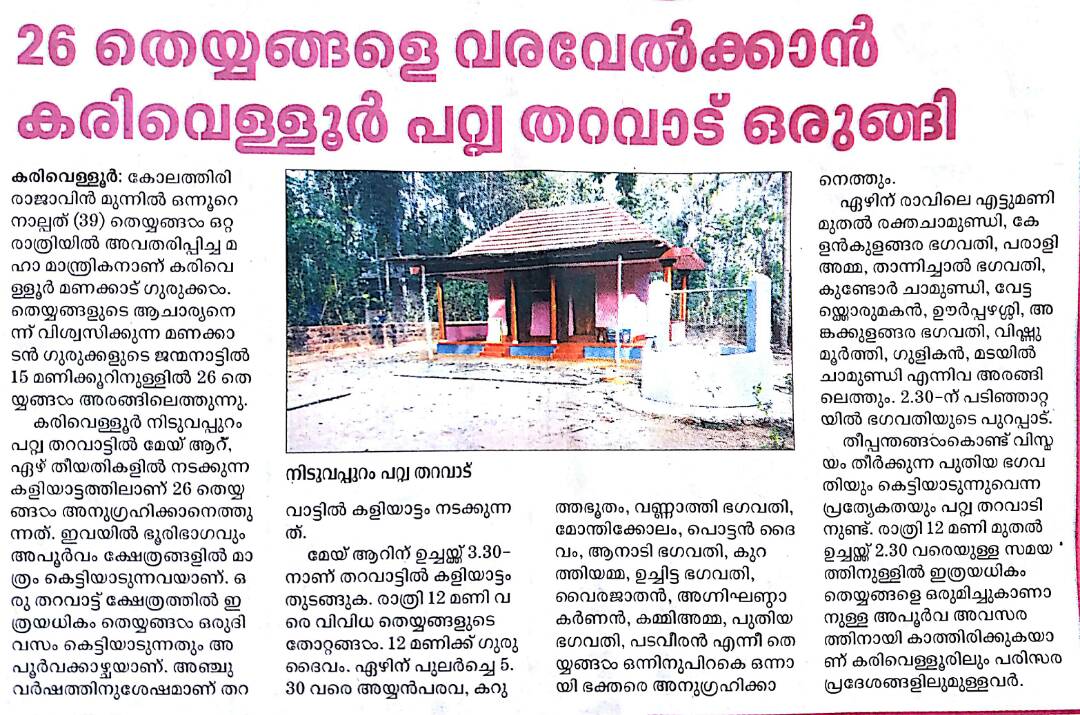 കരിവെള്ളൂര്: കോലത്തിരി രാജാവിന് മുന്നില് ഒന്നൂറെ നാല്പത് (39) തെയ്യങ്ങള് ഒറ്റ രാത്രിയില് അവതരിപ്പിച്ച മഹാ മാന്ത്രികനാണ് കരിവെള്ളൂര് മണക്കാട് ഗുരുക്കള്. തെയ്യങ്ങളുടെ ആചാര്യനെന്ന് വിശ്വസിക്കുന്ന മണക്കാടന് ഗുരുക്കളുടെ ജന്മനാട്ടില് 15 മണിക്കൂറിനുള്ളില് 26 തെയ്യങ്ങള് അരങ്ങിലെത്തുന്നു. കരിവെള്ളൂര് നിടുവപ്പുറം പറ്റ്വ തറവാട്ടില് മേയ് ആറ്്, ഏഴ് തീയതികളില് നടക്കുന്ന കളിയാട്ടത്തിലാണ് 26 തെയ്യങ്ങള് അനുഗ്രഹിക്കാനെത്തുന്നത്. ഇവയില് ഭൂരിഭാഗവും അപൂര്വം ക്ഷേത്രങ്ങളില് മാത്രം കെട്ടിയാടുന്നവയാണ്. ഒരു തറവാട്ട് ക്ഷേത്രത്തില് ഇത്രയധികം തെയ്യങ്ങള് ഒരുദിവസം കെട്ടിയാടുന്നതും അപൂര്വക്കാഴ്ചയാണ്. അഞ്ചുവര്ഷത്തിനുശേഷമാണ് തറവാട്ടില് കളിയാട്ടം നടക്കുന്നത്. മേയ് ആറിന് ഉച്ചയ്ക്ക് 3.30-നാണ് തറവാട്ടില് കളിയാട്ടം തുടങ്ങുക. രാത്രി 12 മണി വരെ വിവിധ തെയ്യങ്ങളുടെ തോറ്റങ്ങള്. 12 മണിക്ക് ഗുരുദൈവം. ഏഴിന് പുലര്ച്ചെ 5.30 വരെ അയ്യന്പരവ, കറുത്തഭൂതം, വണ്ണാത്തി ഭഗവതി, മോന്തിക്കോലം, പൊട്ടന് ദൈവം, ആനാടി ഭഗവതി, കുറത്തിയമ്മ, ഉച്ചിട്ട ഭഗവതി, വൈരജാതന്, അഗ്നിഘണ്ഠാകര്ണന്, കമ്മിഅമ്മ, പുതിയ ഭഗവതി, പടവീരന് എന്നീ തെയ്യങ്ങള് ഒന്നിനുപിറകെ ഒന്നായി ഭക്തരെ അനുഗ്രഹിക്കാനെത്തും. ഏഴിന് രാവിലെ എട്ടുമണിമുതല് രക്തചാമുണ്ഡി, കേളന്കുളങ്ങര ഭഗവതി, പരാളി അമ്മ, താന്നിച്ചാല് ഭഗവതി, കുണ്ടോര് ചാമുണ്ഡി, വേട്ടയ്ക്കൊരുമകന്, ഊര്പ്പഴശ്ശി, അങ്കക്കുളങ്ങര ഭഗവതി, വിഷ്ണുമൂര്ത്തി, ഗുളികന്, മടയില് ചാമുണ്ഡി എന്നിവ അരങ്ങിലെത്തും. 2.30-ന് പടിഞ്ഞാറ്റയില് ഭഗവതിയുടെ പുറപ്പാട്. തീപ്പന്തങ്ങള്കൊണ്ട് വിസ്മയം തീര്ക്കുന്ന പുതിയ ഭഗവതിയും കെട്ടിയാടുന്നുവെന്ന പ്രത്യേകതയും പറ്റ്വ തറവാടിനുണ്ട്. രാത്രി 12 മണി മുതല് ഉച്ചയ്ക്ക് 2.30 വരെയുള്ള സമയത്തിനുള്ളില് ഇത്രയധികം തെയ്യങ്ങളെ ഒരുമിച്ചുകാണാനുള്ള അപൂര്വ അവസരത്തിനായി കാത്തിരിക്കുകയാണ് കരിവെള്ളൂരിലും പരിസര പ്രദേശങ്ങളിലുമുള്ളവര്.