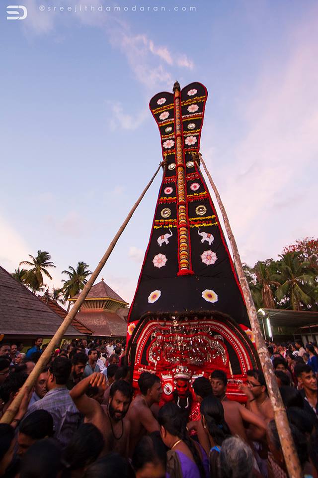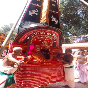 പയ്യന്നൂര് പെരുമാളിന്റെ അനുഗ്രഹം വാങ്ങി യാത്ര തുടര്ന്ന് ക്ഷേത്രപാലകന് അങ്ങിനെ അള്ളടം സ്വരൂപത്തിന്റെ (രാജ വംശത്തിന്റെ) കുലദൈവങ്ങളായി മാറി കാളരാത്രിയോടൊപ്പം. വലിയ മുടി വെച്ച് ആടുന്ന ദേവന്റെ മുടി രണ്ടു മൂന്നു പേരുടെ സഹായത്തോടെ ക്ഷേത്രത്തിനു മൂന്നു വലം വെച്ച ശേഷം എടുത്തു മാറ്റുകയാണ് പതിവ്. അതിനു മുന്നായി ആയുധങ്ങളും മാറ്റും. തെയ്യം ചുവപ്പ് മുടിയും ധരിക്കാറുണ്ടെങ്കിലും കൂടുതലായി കറുപ്പ് മുടിയാണ് ധരിച്ചു വരുന്നത്.