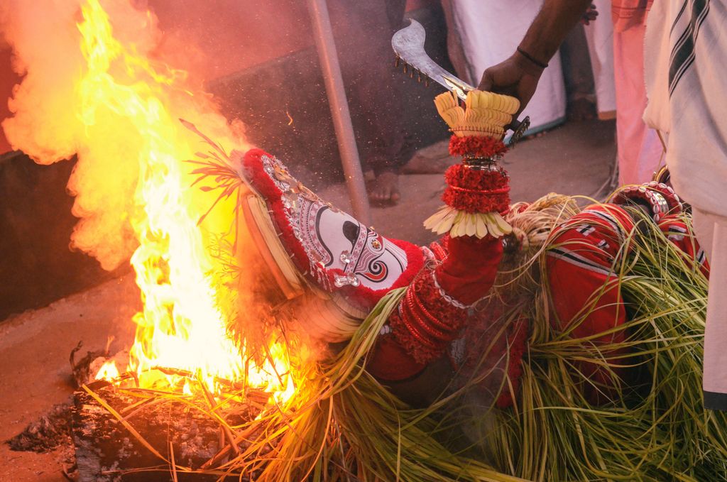 തീയെ പ്രതിരോധിക്കുന്ന കുരുത്തോല കൊണ്ടുള്ള ‘ഉട’ ഉണ്ടെങ്കിലും വളരെ ശ്രദ്ധയോടെ ചെയ്തില്ലെങ്കില് പൊള്ളലേല്ക്കാന് സാധ്യതയുള്ള ഒരനുഷ്ടാനമാണിത്. കത്തുന്ന തീയില് ഇരിക്കുമ്പോഴും “കുളിരണ്, വല്ലാതെ കുളിരണ്” എന്നായിരിക്കും പൊട്ടന് തെയ്യം പറയുക. സമൂഹത്തിലെ ജാതി മത വര്ണ്ണ വിത്യാസങ്ങള്ക്ക് നേരെ പരിഹാസം പ്രധാന ആയുധമാക്കുന്നുണ്ട് പൊട്ടന് തെയ്യം.