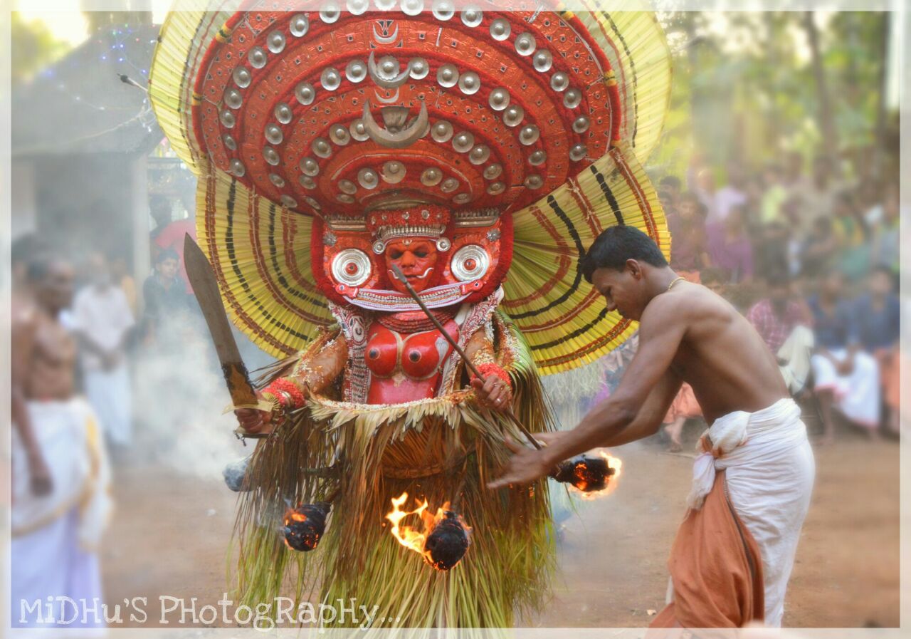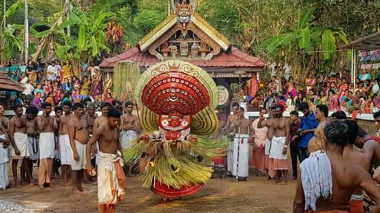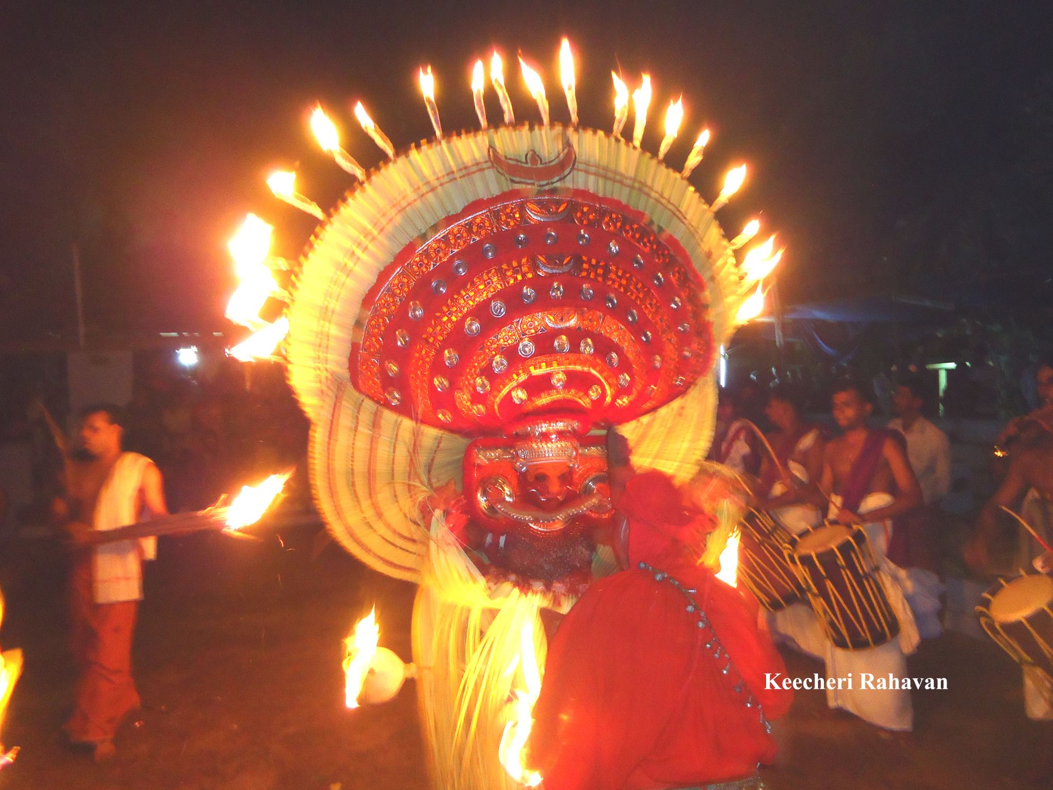 Puthiya Bhagavathi was originated from Homa Kundam (Fire). Lord Shiva was a happy living in the heaven with his two daughters. They were born from the third divine eye of Shiva. Suddenly fatal disease spread out there and most of the members were fallen ill. Then Lord Shiva decided to send his daughters to the earth and ordered his courtiers to conduct a kind of ritual called “homam” to eradicate the all evils. It is believed that the ‘Goddess’ Bhagavathy emerged from the fire ember and everyone narrated the situation prevailing there and the condition of the people and the purpose of eradicating the diseases. They offered fresh hen’s blood to Bhagavthy to quench her thirst and as a miracle all evils and the chronic diseases disappeared from the destiny. It was described that further she came to earth in Kolathnadu and blessed the people for a healthy peaceful life. To commemorate the divine power of the deity the then Chieftain of Kalathnadu ‘Chirakkal Raja’ ordered to perform this Theyyam.